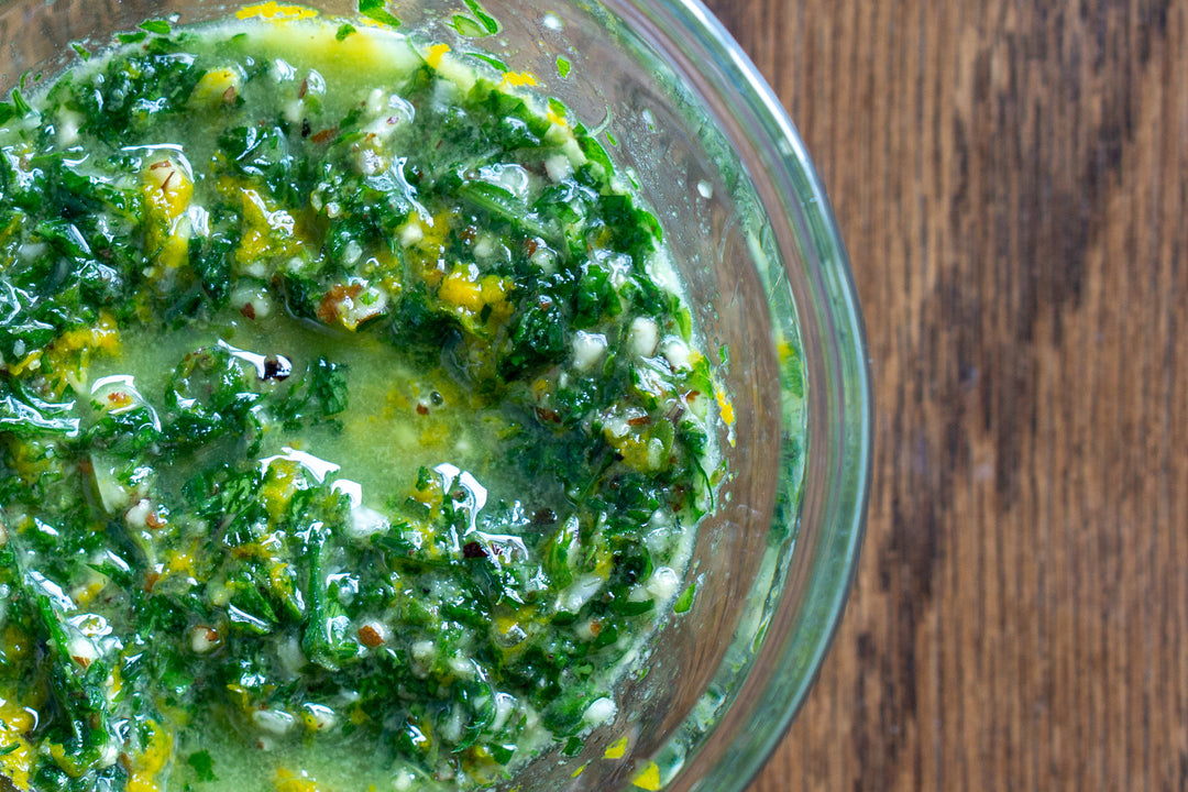 Add carrot tops, cilantro, oregano, garlic, orange zest, pecans, and coconut oil to a cuisinart and pulse for a few seconds until well combined. Transfer to a small bowl and season with salt and pepper to taste. This sauce goes well with pasta, fish, chicken and can be used as a crust on beef. Store in an airtight container, in the fridge for up to 1 week.